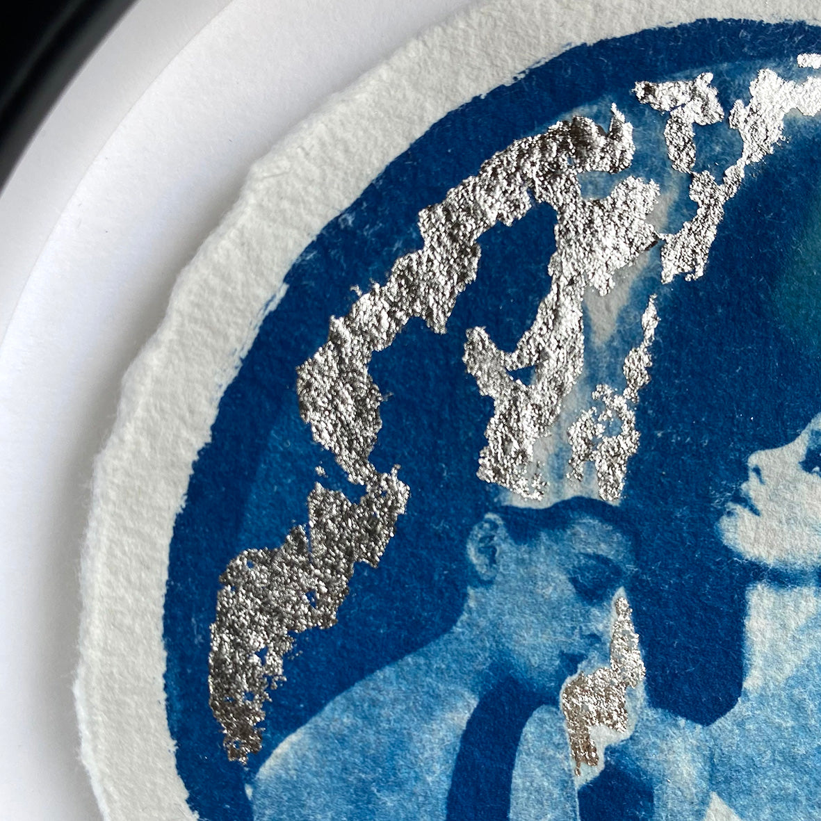 Inspired by extraordinary women, each cyanotype is an original, handcrafted creation, developed on handmade paper from collages, photographic portraiture, photograms, and contact prints of natural forms and found objects.