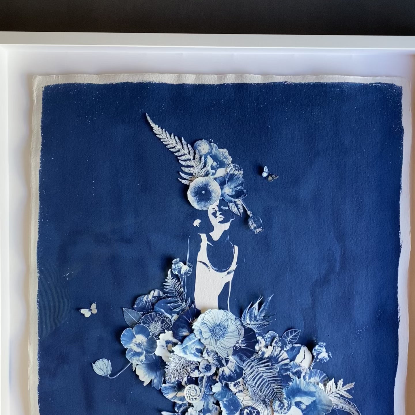 The print is then processed by thoroughly washing in water to remove any unexposed solution. It can then be hung to dry, developing to full density Prussian blue after 24 hours. Once dried the individual elements are hand cut and collaged together to create a multi-layered paper cut artwork.
