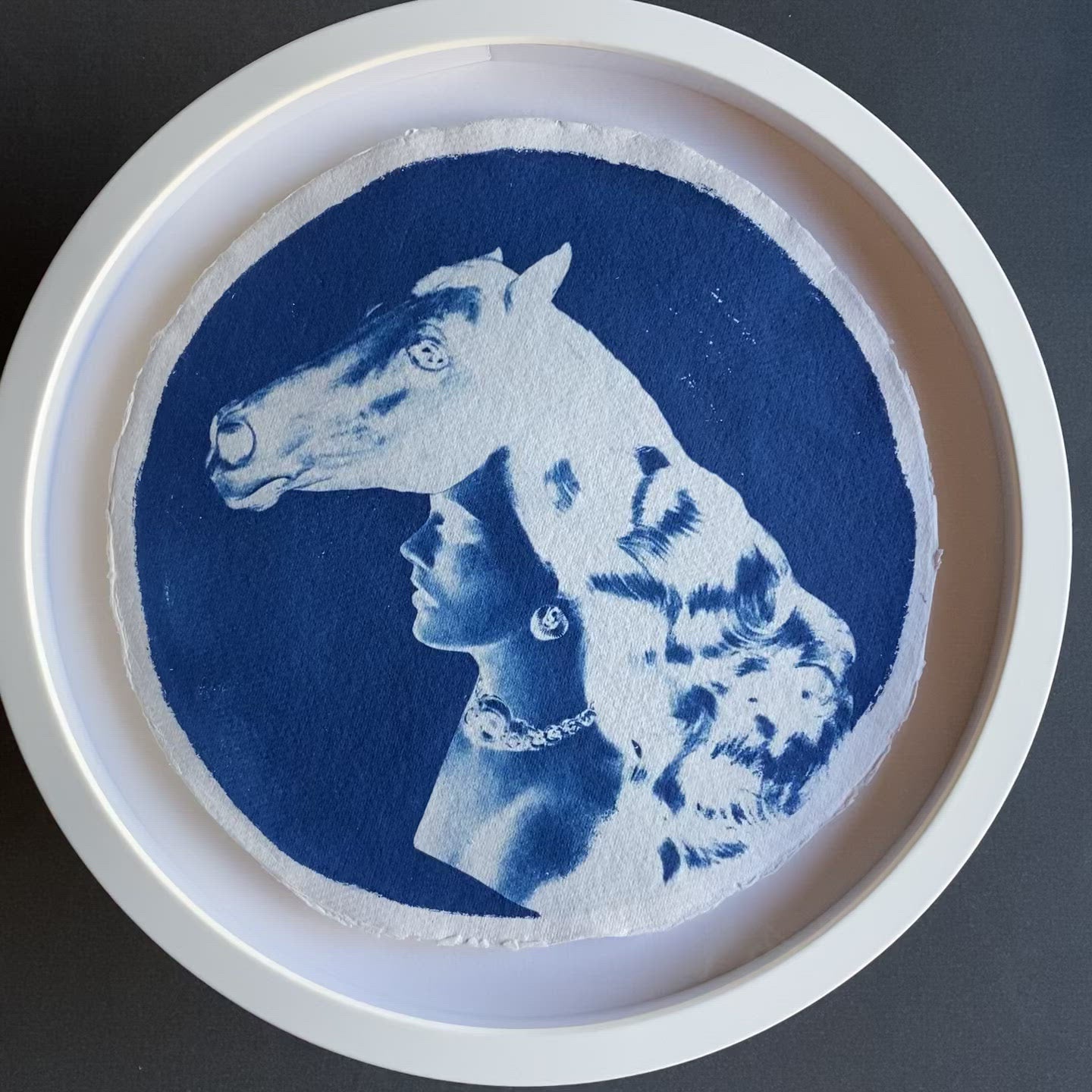 Queen Boudicca In Blue was created by constructing a hand-cut collage using female photographic portraiture and hand drawn illustrations of a horse head and ancient torque.After coating the handmade paper with light-sensitive chemistry, it is left to dry in a dark room. The large scale negative is then contact printed onto the paper by exposing to daylight (UV rays).