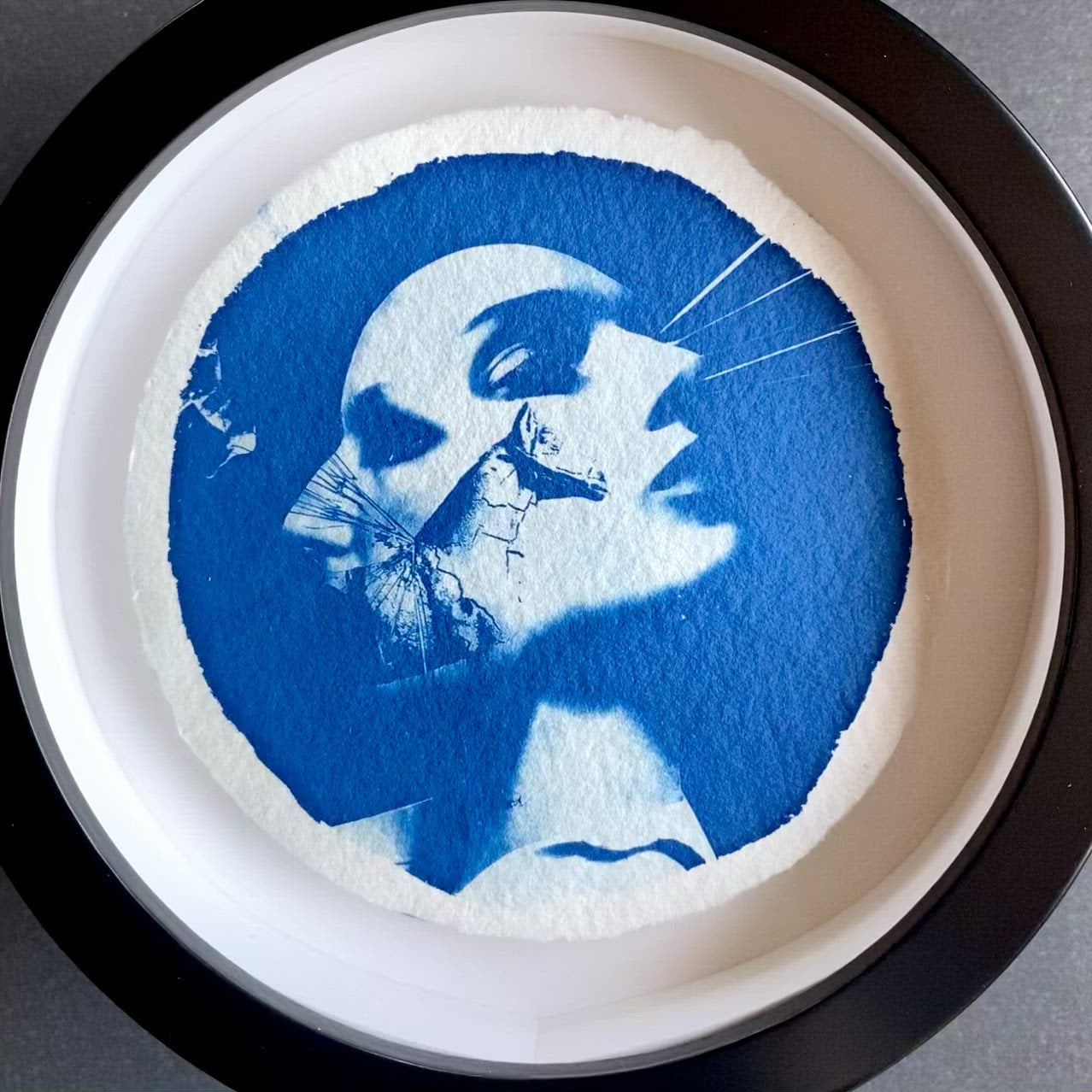 All framed cyanotypes are float mounted. The artwork floats above a snow-white mount board, showcasing the paper texture and deckled edging.Paper